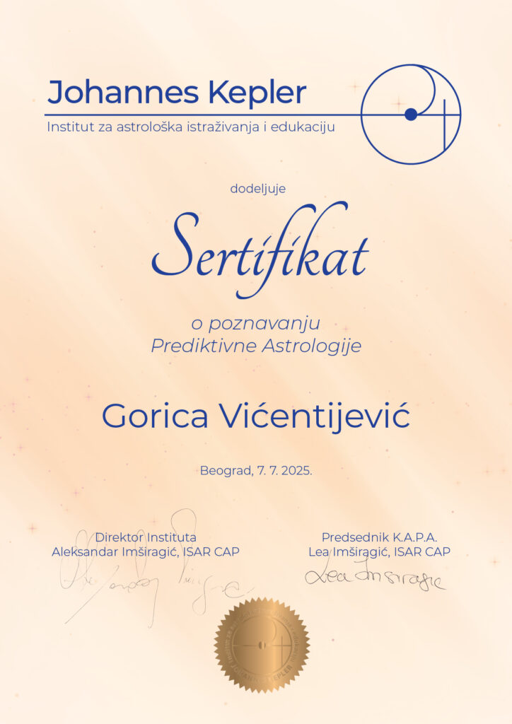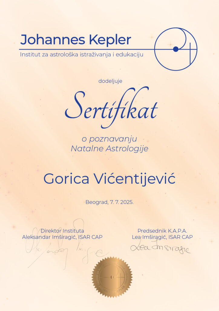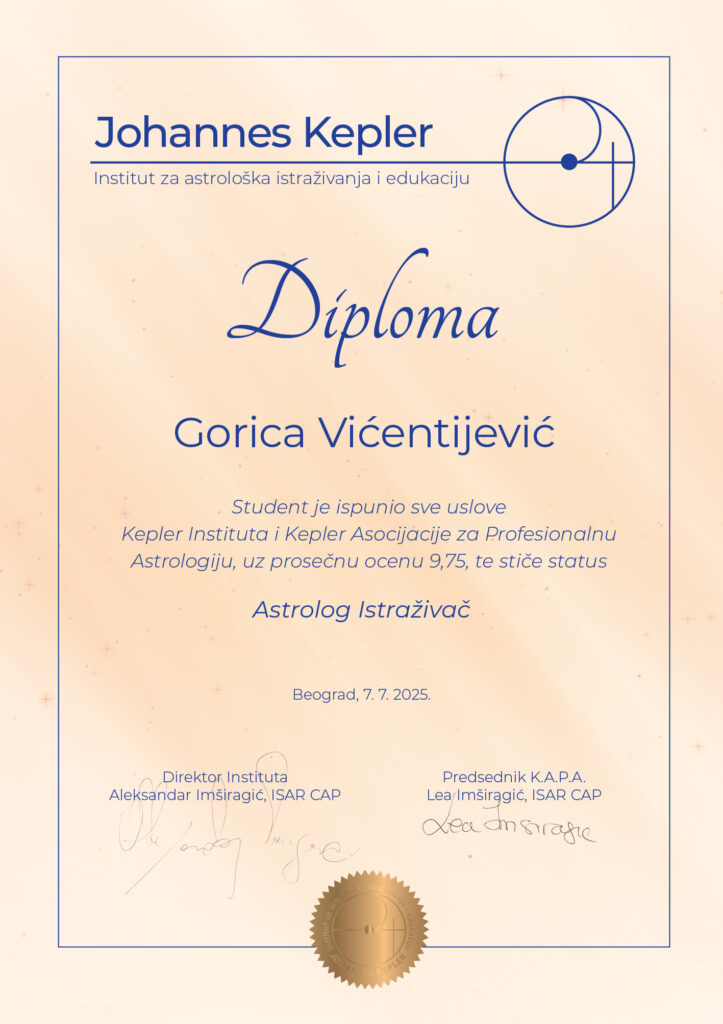 Dve decenije kasnije, 2025. godine, diplomirala sam na Astrološki institut Johannes Kepler i stekla status astrologa istraživača. Tokom godina istraživanja posebno su me privukle evolutivna i karmička astrologija, ali ono što me najviše inspiriše jeste dečja astrologija. Ako dete ne usmerimo na početku njegovog puta, često se kasnije suočavamo s isceljivanjem rana iz detinjstva, što danas vidim kroz rad sa mnogim klijentima.