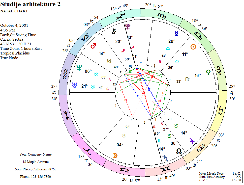 Mars, u znaku Bika između Jupitera (prostor) i Saturna (vreme), vodi ka odluci o studiranju arhitekture. Mesec u Raku, u sekstilu sa Marsom i Saturnom, podržava ovu odluku jer simbolizuje gradnju, stabilnost i dugotrajnost. Mesec u šestoj kući, u sekstilu sa Jupiterom (vladarem jedanaeste kuće), ukazuje na posao povezan sa kolektivima i udruženjima, posebno vezano za stambene prostore i nekretnine.