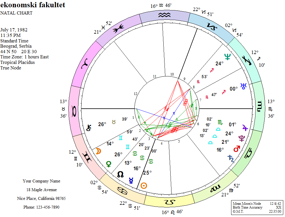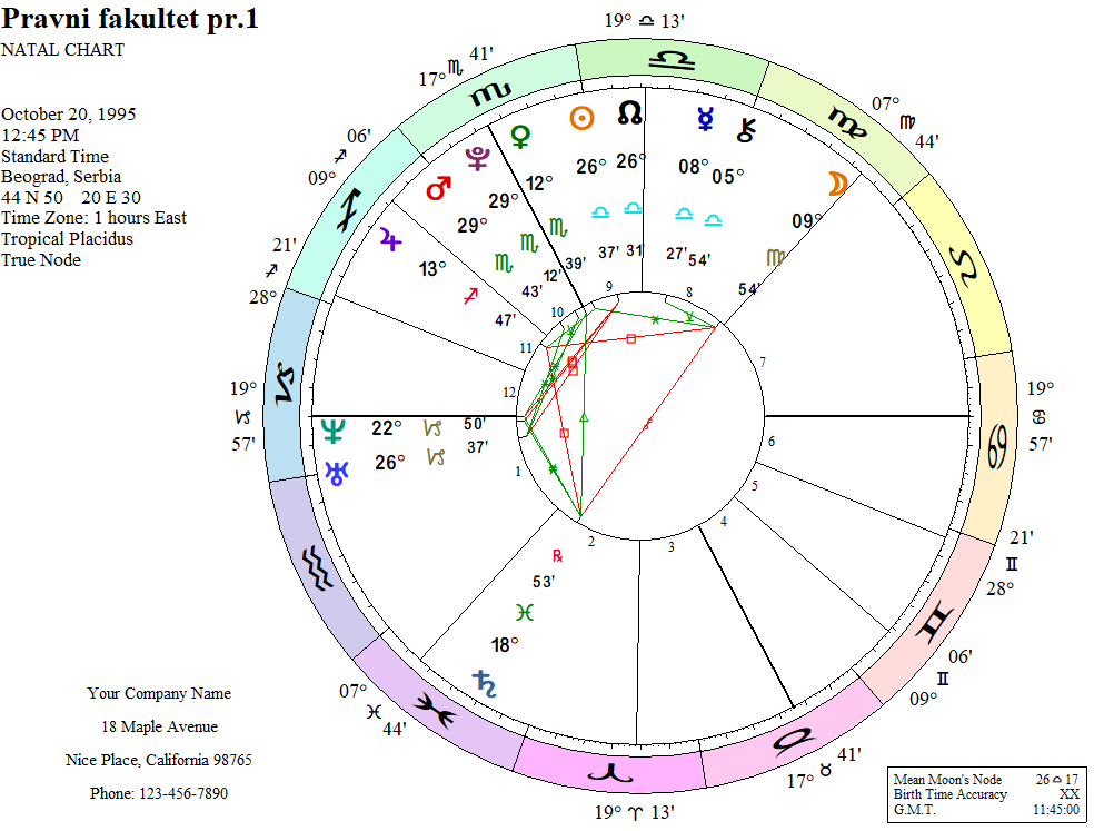 Venera, kao vladar Vage, smeštena u znaku Škorpije, gradi harmoničan sekstil s Mesecom, vladarem sedme kuće, što dodatno naglašava teme pravde, javnosti i pravnih poslova. Ova astrološka kombinacija sugeriše da bi pravni fakultet bio izuzetno pogodan izbor, pružajući osobi priliku da iskoristi svoje prirodne sposobnosti za analizu, pregovaranje i uspostavljanje pravnih i društvenih ravnoteža.Podrsku Veneri kao vladaru devete kuce, daje i Saturn, vladar ascedenta, pa je ova osoba u roku završila studije.